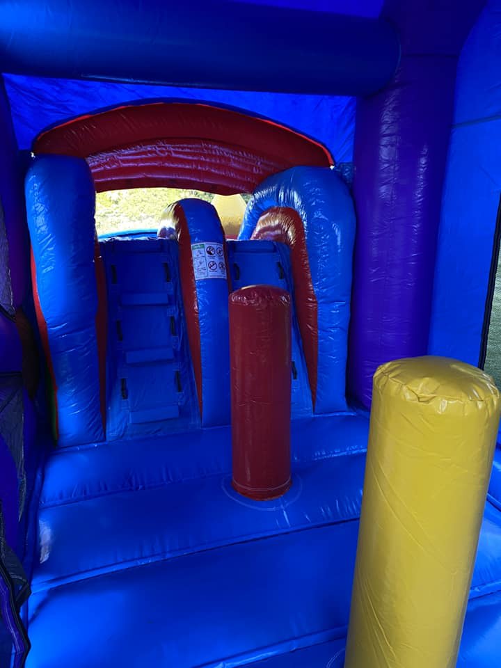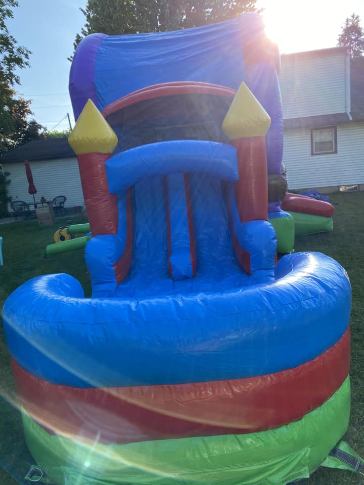 Reach for the sky as you slide down the dual-lane slide, choosing between a refreshing splash into the pool below (wet option) or an exhilarating dry ride. Whether you prefer a watery adventure or a thrilling dry ride, our Ferris Wheel Bounce House has something for everyone.